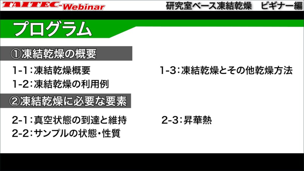 *なお続編としまして、実際に弊社の凍結乾燥機を使用したシステムのセットアップ法(必要な装置構成、機種選定のポイント、接続のしかた)のビギナー向けウェビナーを1月末頃に予定しております。